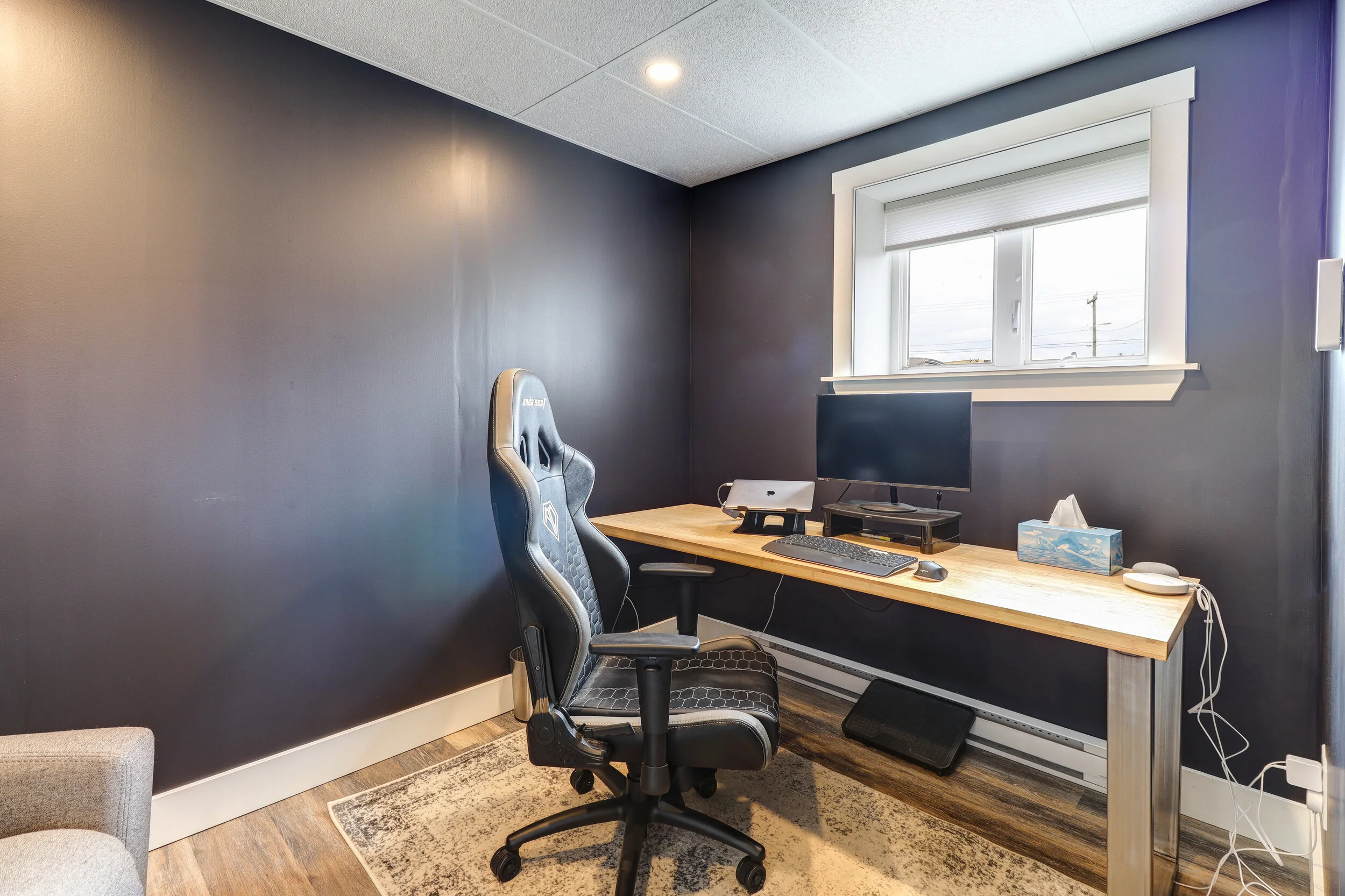 The partially above-grade basement is unfinished with lots of storage but includes a finished office and furniture in the main area. The back deck includes a dining table and steps into a fenced-in yard with space for pets or kids to play. The side garden has 4 large raised garden beds for gardening. The large garage and paved driveway offer 3 off-street parking spaces.